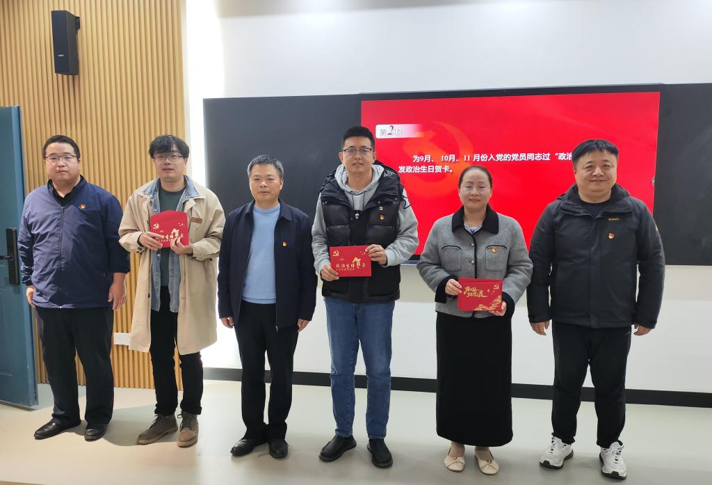 教工党支部书记刘向杰为3位过“政治生日”的教师党员发放“政治生日”贺卡,送上“生日寄语”,提醒党员们时刻牢记初心使命,以共产党员的实际行动勇当时代先锋。全体党员起立奏唱《国际歌》刘向杰为预备党员授戴党,并带领预备党员与老党员面向党旗庄严宣誓。