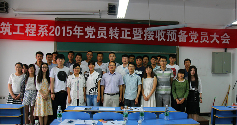 6月25日下午,在3B204教室举行了建筑工程系党支部预备党员转正暨接收新党员大会。出席会议的有:系党总支书记徐前进、建筑工程系主任张鹏及建筑工程系部分教师、学生党员,会议由学生党支部书记闫巧云老师主持。