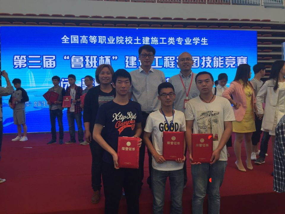 由住房和城乡建设部人事司主办、全国住房和城乡建设职业教育教学指导委员会组织实施的第三届“鲁班杯”建筑识图技能竞赛于2016年6月3日—5日在青岛举行,本次大赛共有来自全国184所知名职业院校代表队的552名学生参加。我院由建工系副主任王永老师带队兼指导,指导教师贾彦丽、王智博和学生李远伟、杨保坤、徐宪法共同组成代表队参赛。经过建筑识图、结构识图和CAD绘图三个环节的激烈比拼,我院代表队最终获得团体优秀组织奖,来自建工14303班的杨保坤和造价14304班的李远伟分别获得个人二等奖。我院代表队虽然是首次参加,但成绩可喜可贺!
