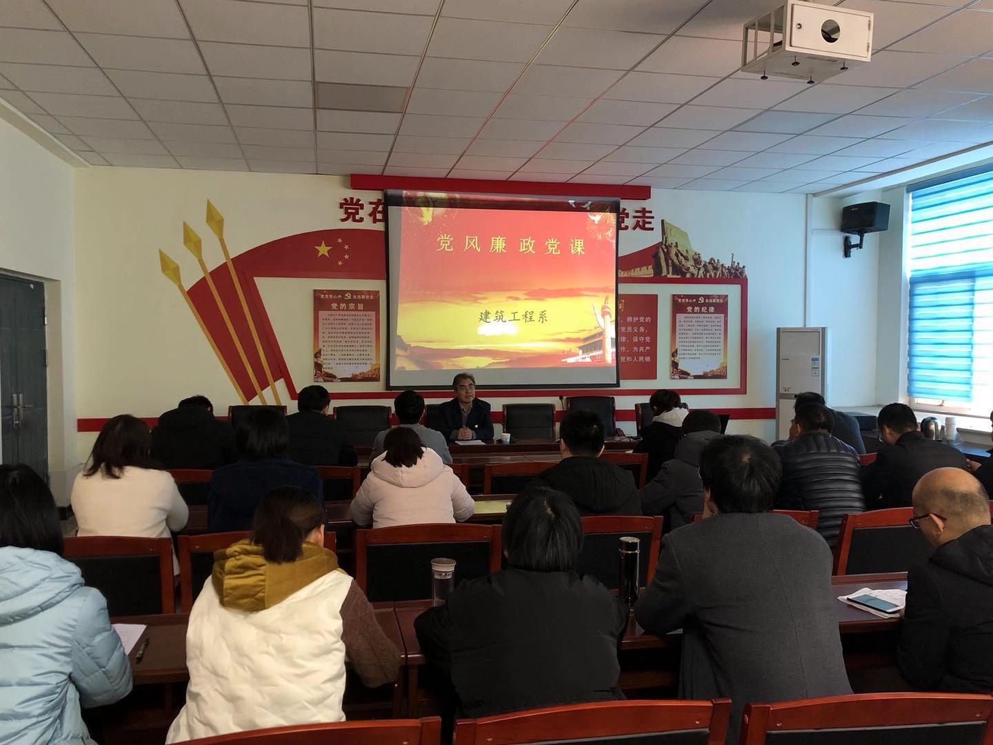 12月19日下午,在3A219会议室建筑工程系组织开展党风廉政专题党课,学院党委委员副院长夏连学为建筑工程系党总支上了一次生动、深刻的党风、廉政党课。