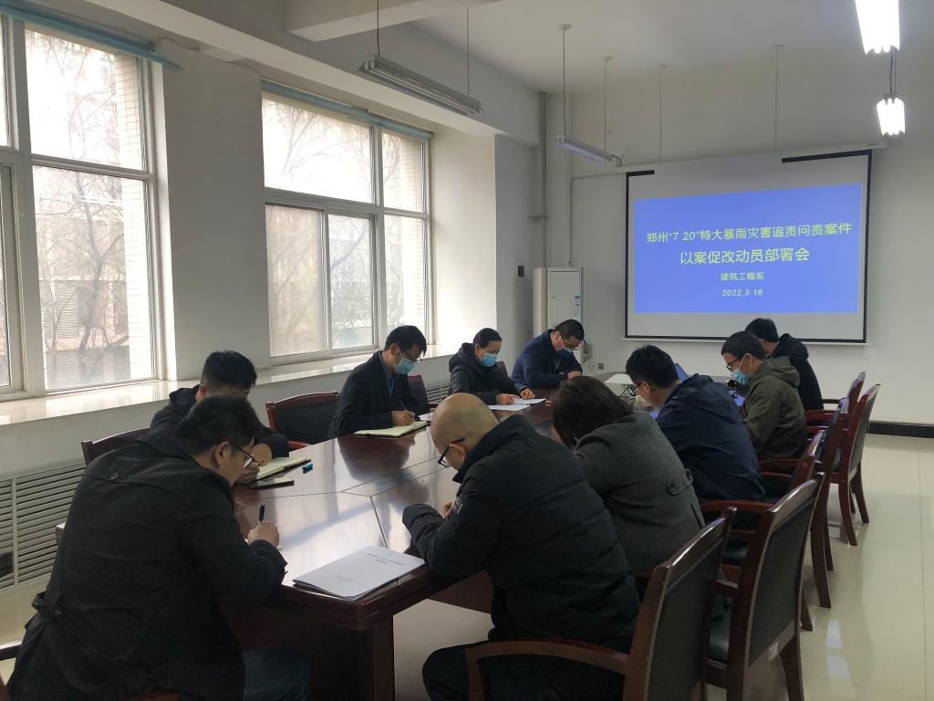 3月16日下午,建筑工程系在致用楼会议室召开郑州“7·20”特大暴雨灾害追责问责案件以案促改动员部署会,会议由建工系党总支书记谭萍主持,系部各科室负责人及坐班教师参加会议。