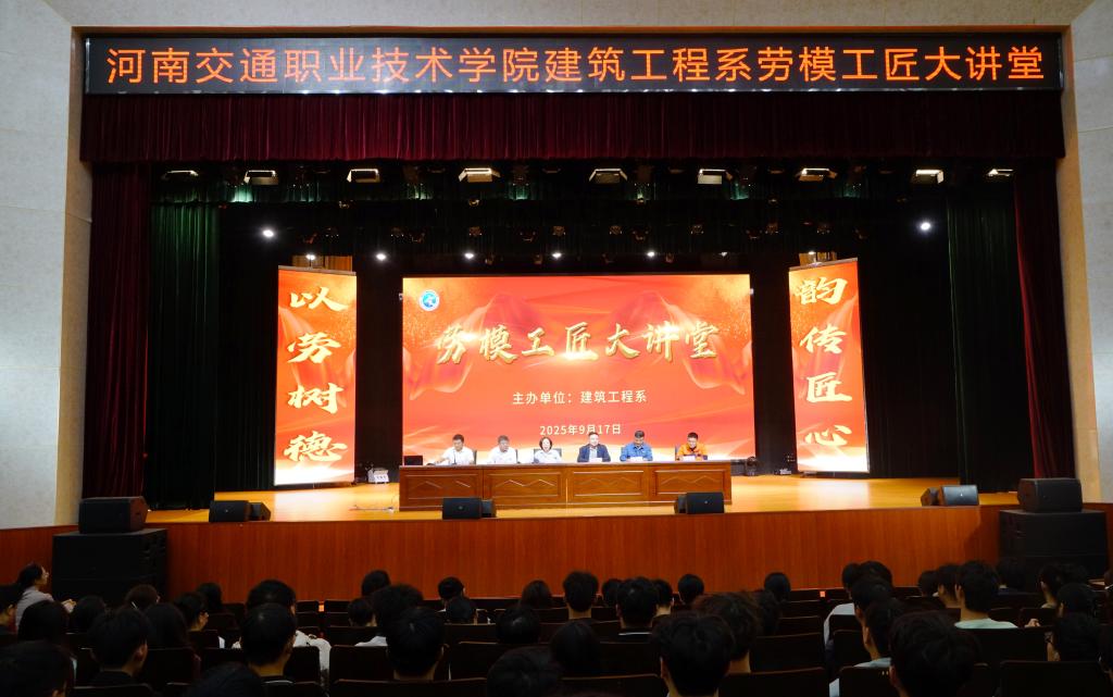 9月17日下午,学校邀请全国五一劳动奖章获得者李亚光、陈建平两位专家在学校郑东校区文化艺术中心举办“劳模工匠大讲堂”专题讲座。副校长刘芝梅出席活动并讲话。党委宣传部、学生工作处负责人参加活动,建筑工程系全体教师及2025级新生共700余人参加活动。