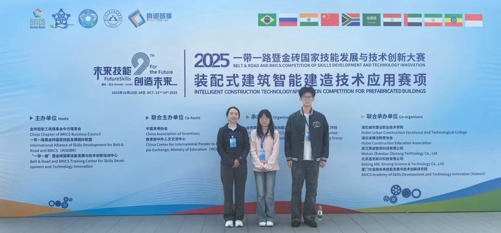 10月22日—10月24日,2025“一带一路”暨金砖国家技能发展与技术创新大赛装配式建筑智能建造技术应用赛项决赛在湖北城市建设职业技术学院举办。学校代表队与来自全国的123支参赛队伍同台竞技,建筑工程系学生包金莹、胡逸轩凭借突出表现荣获三等奖。