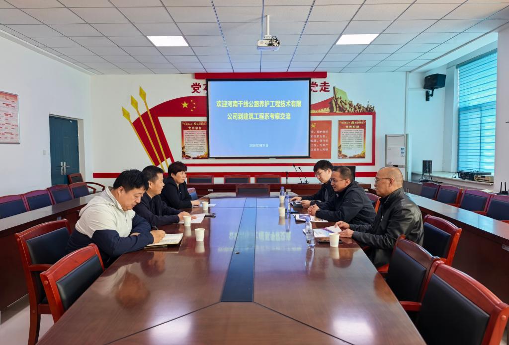 3月31日上午,河南干线公路养护工程技术有限公司董事长李东军、总经理李新建一行三人到建筑工程系考察交流,建筑工程系主任刘向杰及相关教师参加座谈会。