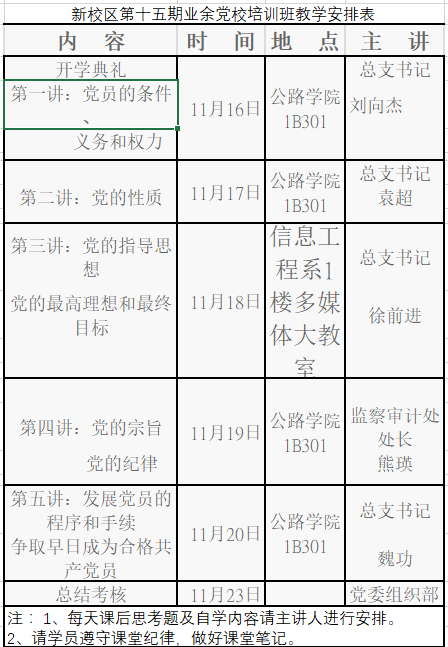 各党总支要选派1名教师党员任带队老师。负责学员培训的组织实施工作。跟踪了解培训情况,采取全过程监督,协助党校做好学员管理,确保培训秩序。各系(院)要指派一至两名学生干部任小班(每个系(院)为一小班)班长、副班长,负责本系学员的组织与考勤,并协助辅导员开展工作。培训结束后,学员必须参加培训班结业考试,成绩合格者发给结业证书。结业成绩和学员在培训期间的表现,作为入党考核内容。