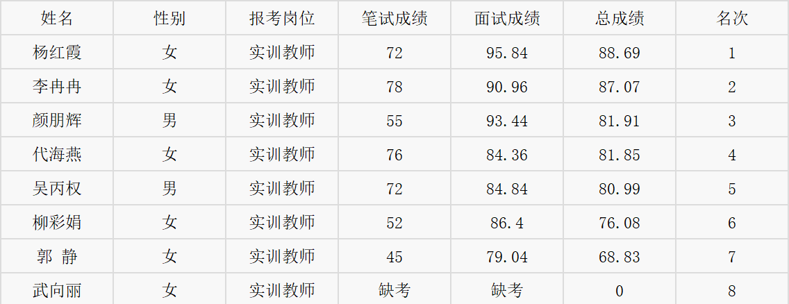 河南交通职业技术学院2015年公开招聘人事代理人员工作已于4月23日结束,现将笔试、面试及总成绩予以公示。