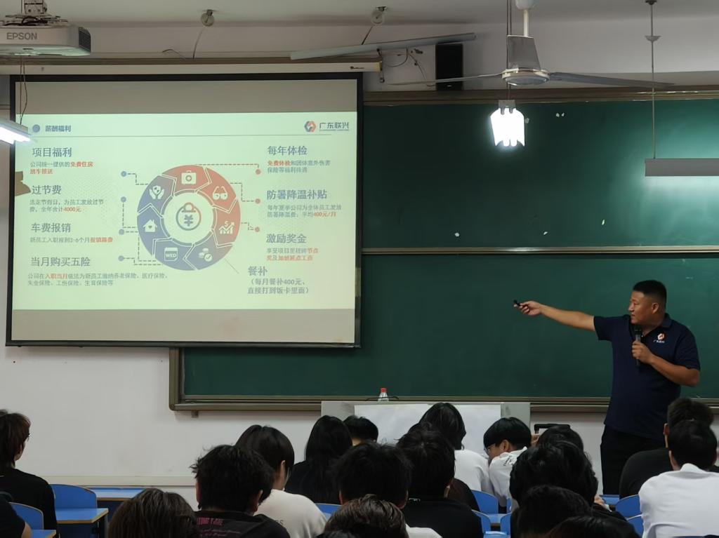 会上,广东联兴建设有限公司华中区经理王中良全面阐述了企业成长轨迹、核心价值观、管理体系、经营领域,以及岗位需求、员工薪酬待遇及职业发展等内容。互动环节,同学们踊跃提问,围绕岗位职责、职业前景、学习发展等话题与招聘宣讲人深入交流,工作人员逐一解答,现场氛围热烈融洽。