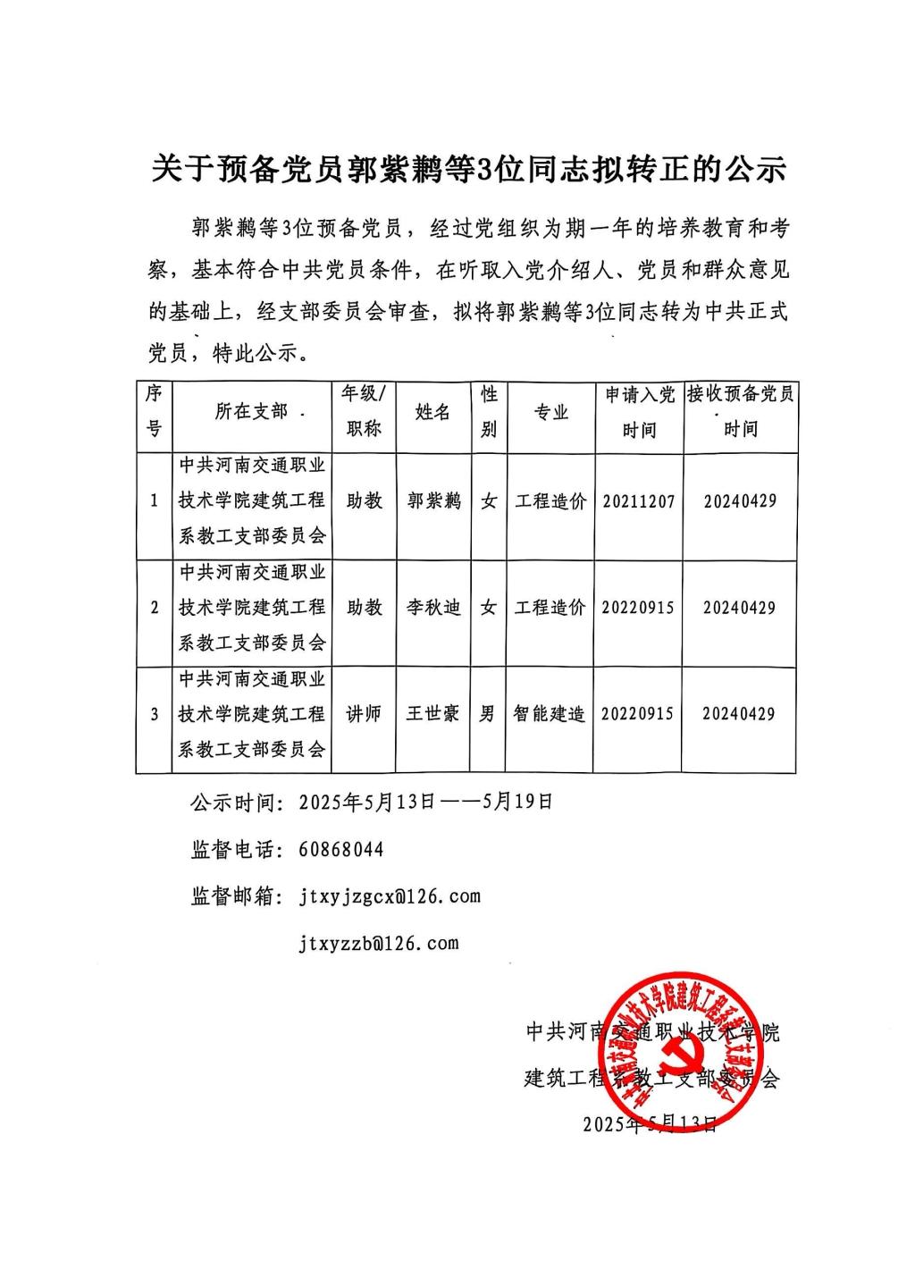 关于预备党员郭紫鹣等3位同志拟转正的公示