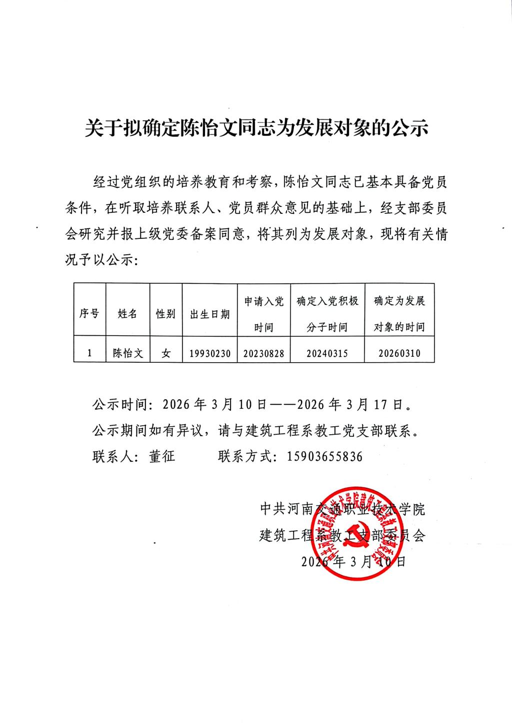 关于拟确定陈怡文同志为发展对象的公示